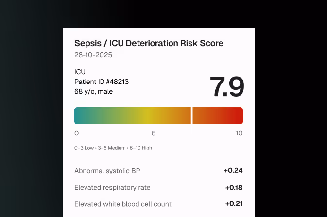Sepsis or ICU deterioration risk scores with transparent factor contributions and clinician override logs.